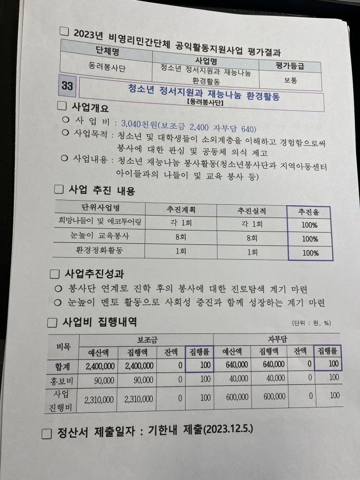 2023년 비영리민간단체 공익활동지원사업-동려봉사단 평가결과