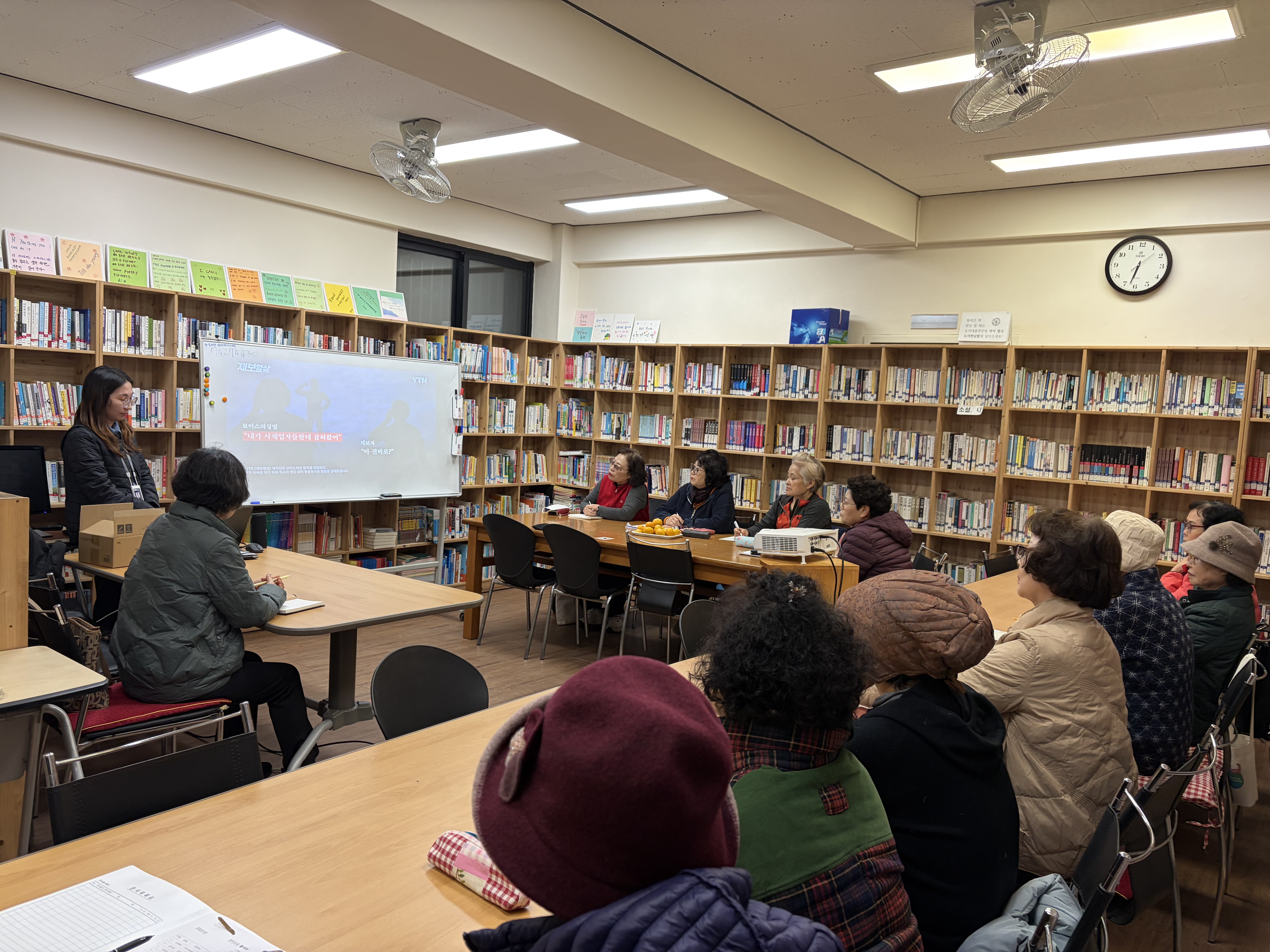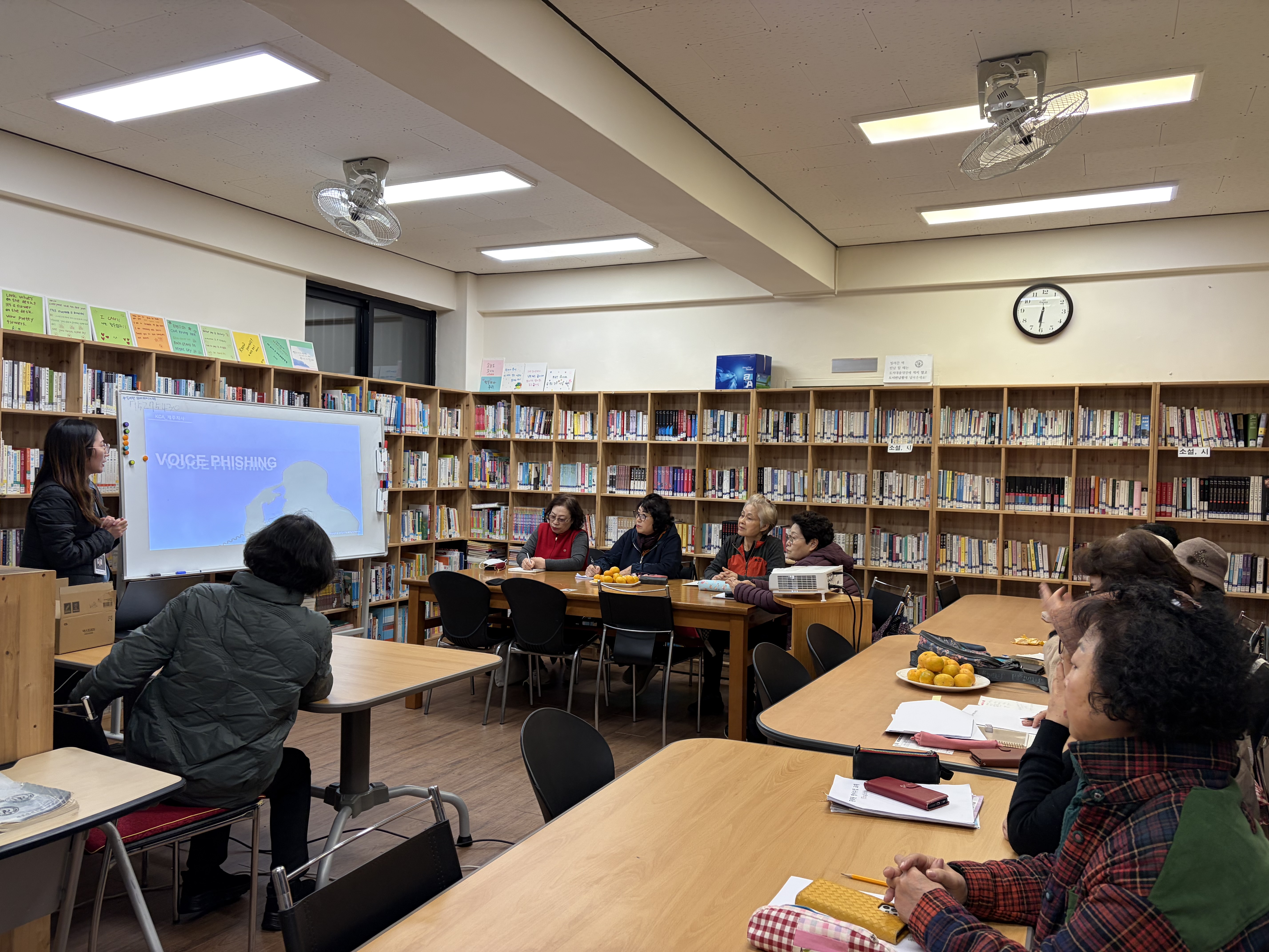 2025년 11월 20일(목) 18:30 (작은도서관), 한국방송통신전파진흥원에서 동려문화원생들을 위한 보이스피싱 및 전자파교육을 하였다. 물품인 A4용지 10박스도 꾸준히 지원해 주고 있다.