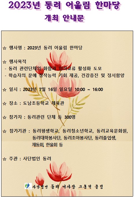 2023년 동려 어울림 한마당 개최 안내 페이지 정보 작성자 동려 작성일23-06-22 19:25 조회3,424회 댓글0건 다음글 목록 본문 동려관련 단체 등 많은 협조 부탁드립니다. -사단법인 동려- [이 게시물은 동려님에 의해 2025-09-19 17:49:35 공지사항에서 이동 됨] 댓글목록 등록된 댓글이 없습니다. 다음글 목록
